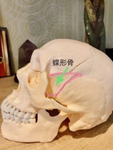 顔のゆがみの施術で大切なのは、こめかみあたりにある「蝶形骨」と下顎と上顎とのバランスを整えることです。
