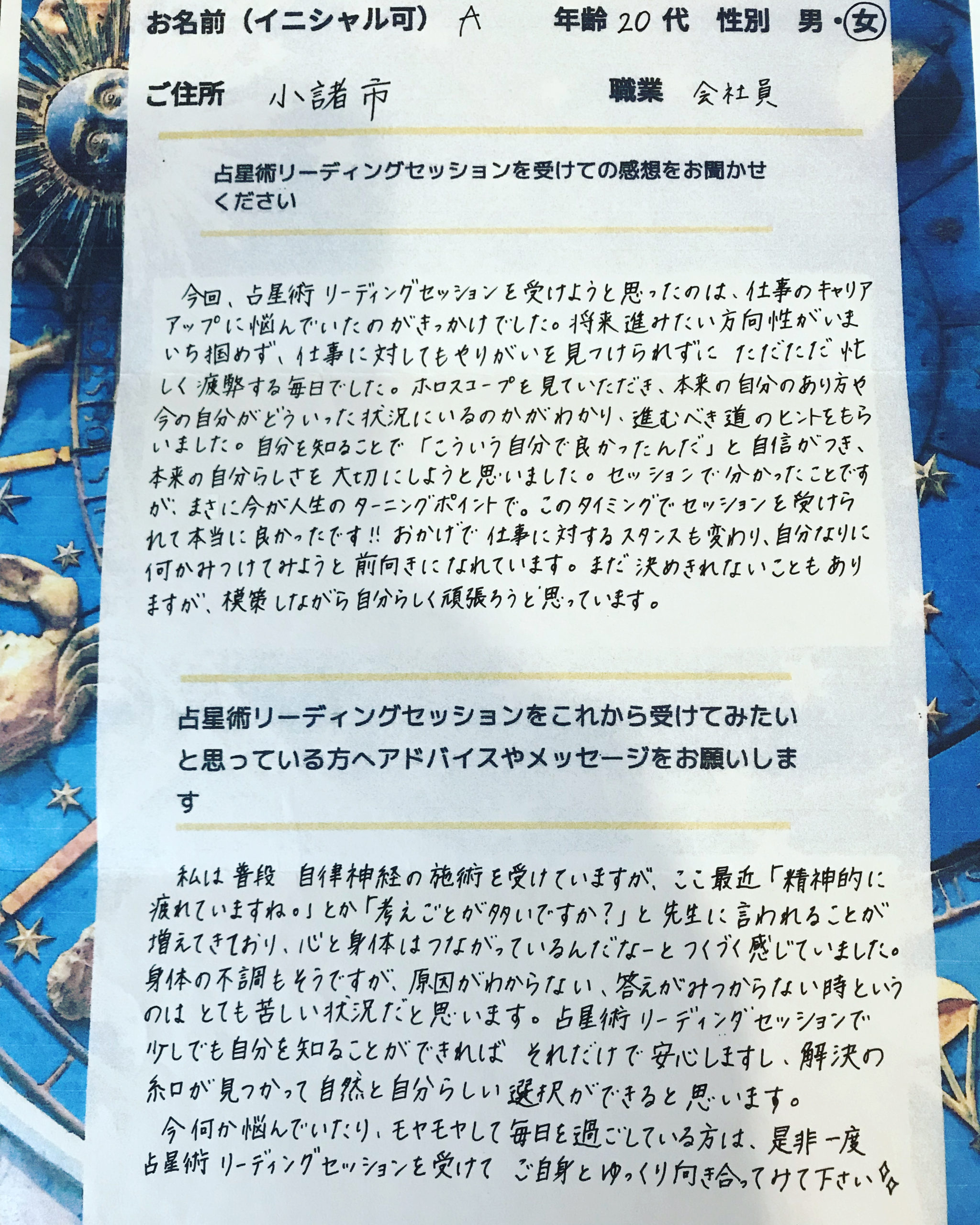 西洋占星術ホロスコープリーディング「コア・アストロジー」セッションのご感想