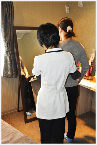 施術後も鏡の前で姿勢やお身体のラインを一緒にチェックをして施術前、施術後の変化の確認をしていただきます。