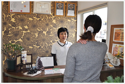 来院されましたら、まずスリッパに履き替えてください。受付をすませたら、待合のソファーに掛けて、簡単な歪みチェックシートとカウンセリング票の記入をしていただきます。
